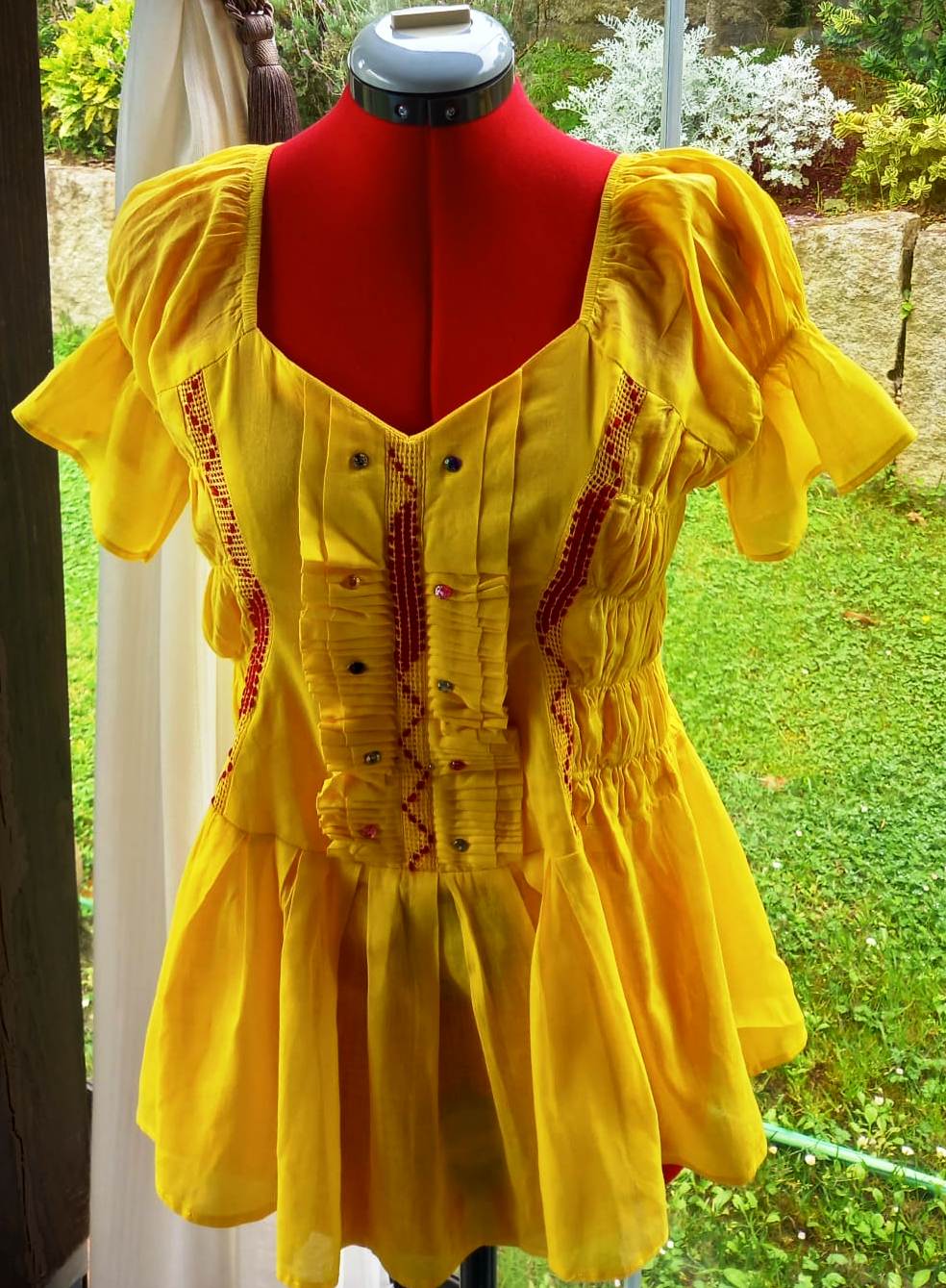 • Color: amarillo y adornos en rojo.