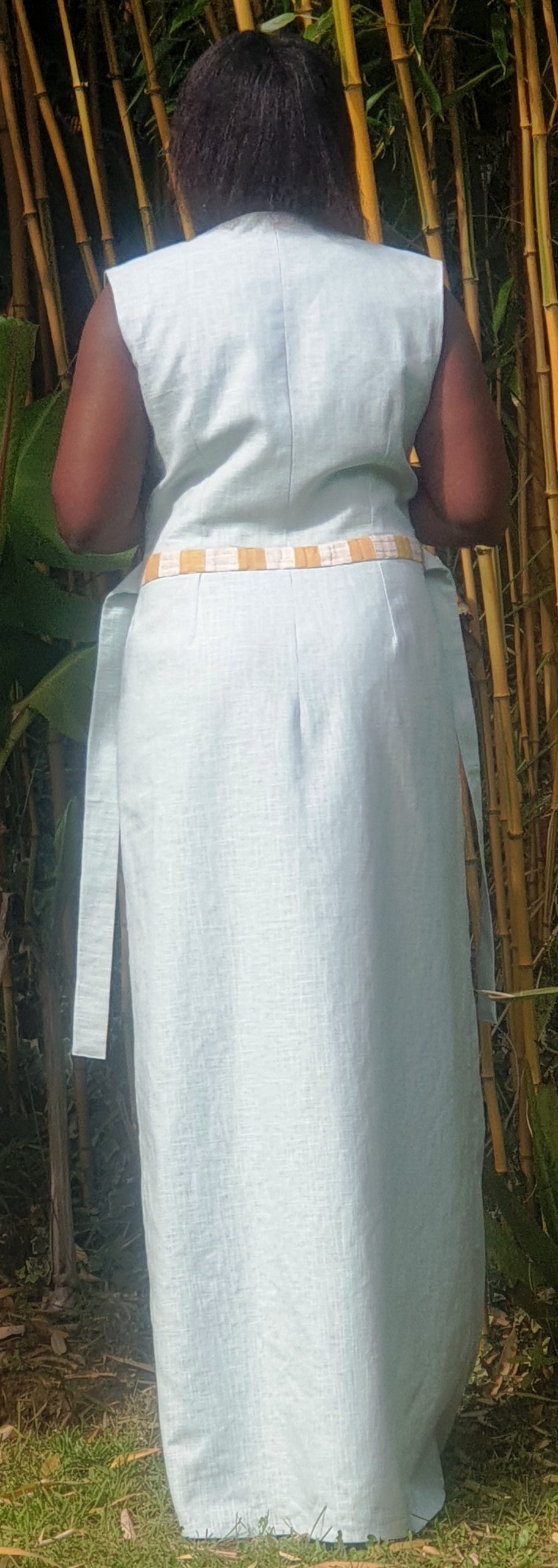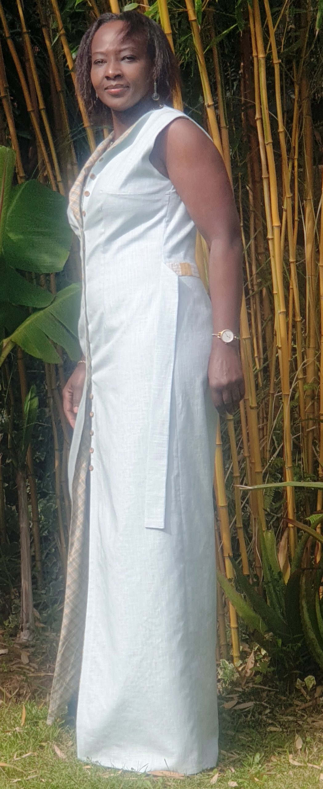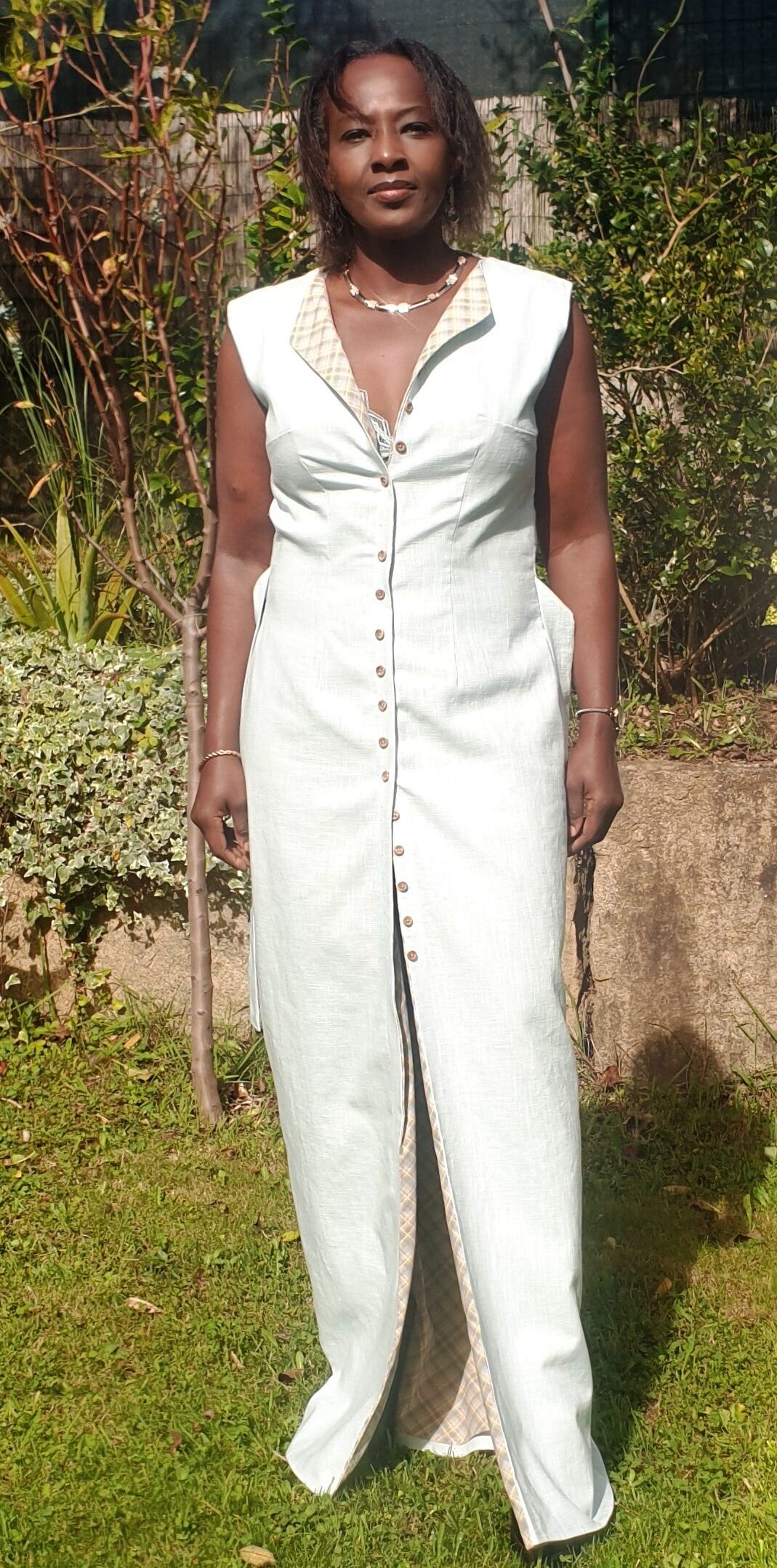 Vestido largo lino con patchwork y botones madera mujer
